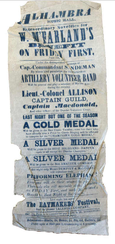 Alhambra Music Hall playbill dating from 1867, advertising William McFarland’s Benefit, Artillery Volunteer Band, Gold Medal: Comic Vocalist, Silver Medal: Best Highland Dancer, Silver Medal: Amateur Gymnast, Performing Elephant, and The Haymakers Festival.
